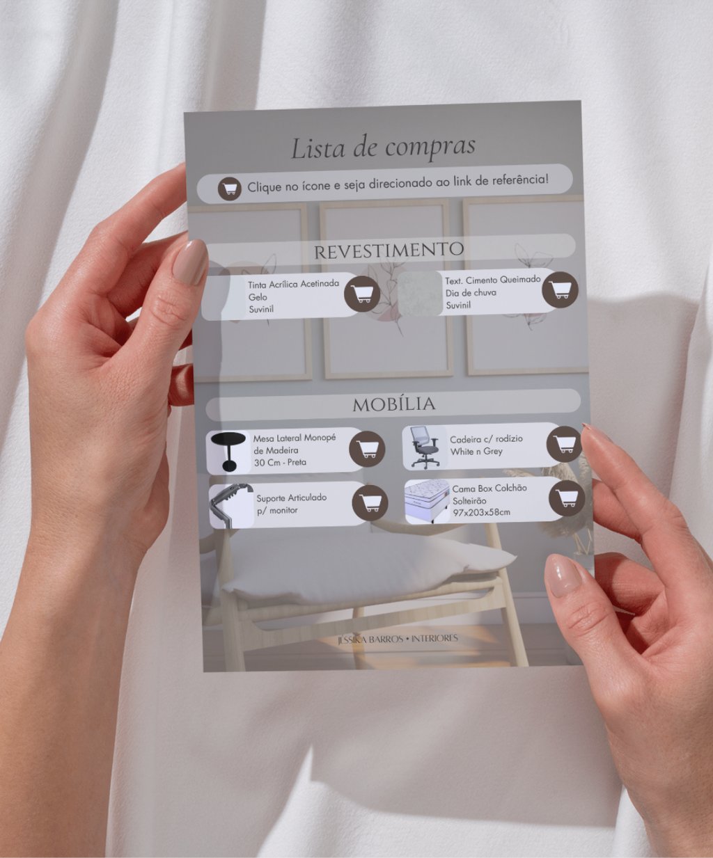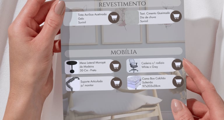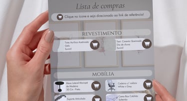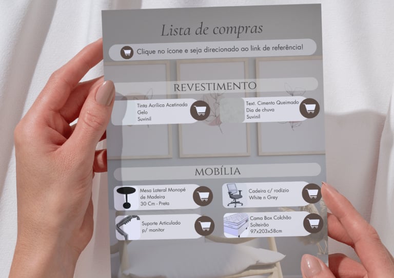 ✓ Lista de compras com quantitativo, medidas e link (especificação das tintas, móveis soltos, luminárias e adornos (quadros, espelhos, tapetes e cortinas)